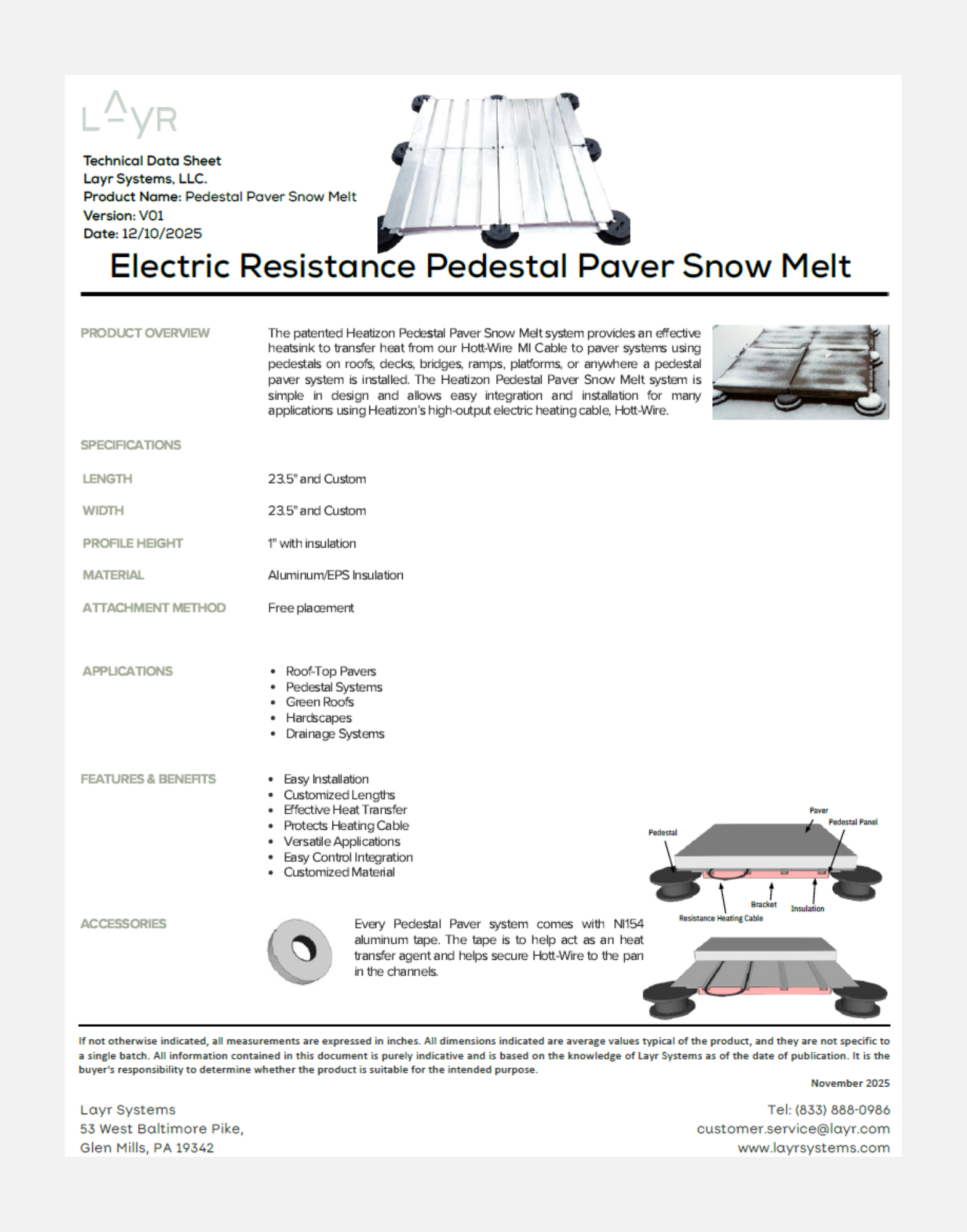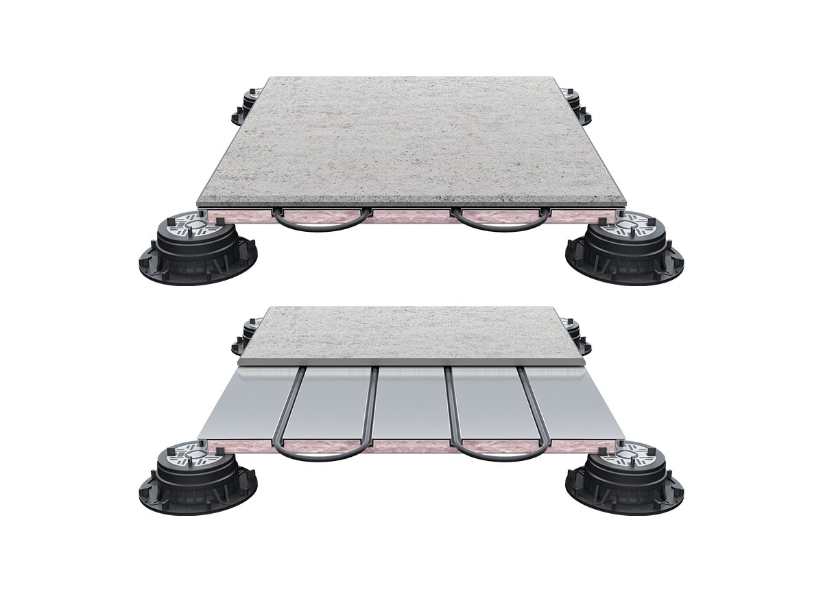 The Layr-Heatizon Snow Melt system is designed to provide efficient and effective snow melting capability for pedestal-mounted pavers on exterior elevated surfaces, including roof decks, terraces, patios, and walkways. Surface heating is provided by electrical heating cables laid under the pavers.